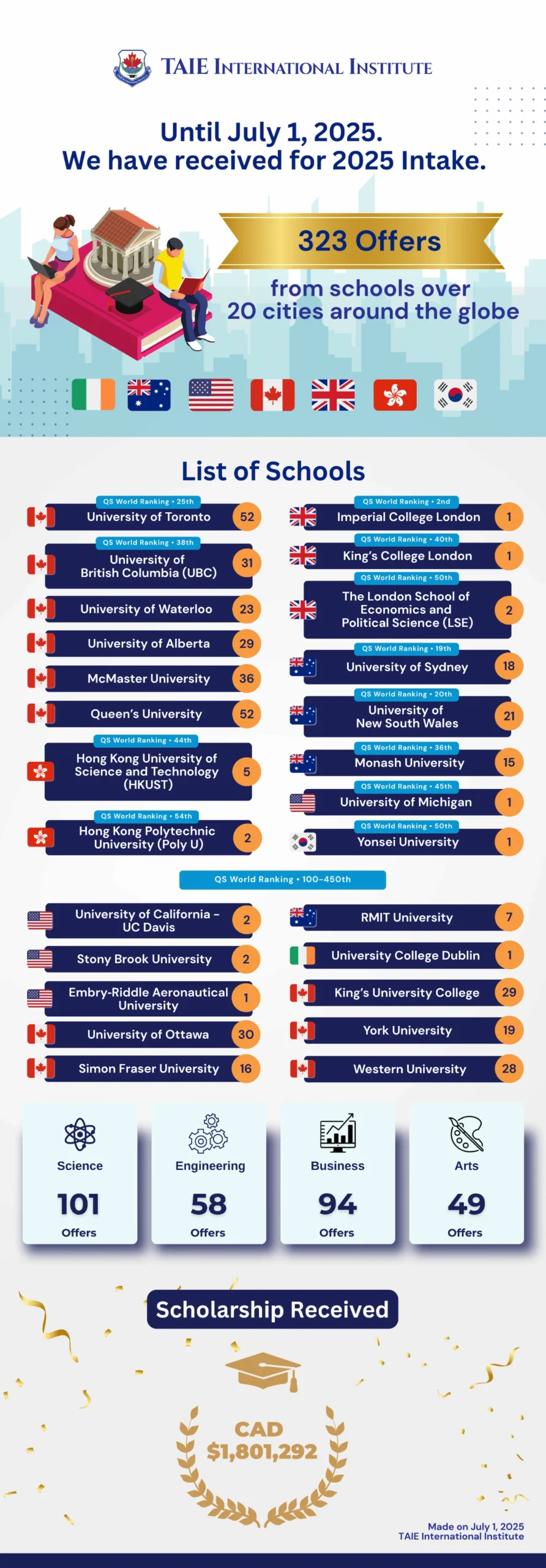 In 2025, our students received offers from top UK universities, including Imperial College London, the London School of Economics, and King's College London. In Canada, they earned a high volume of offers from the University of Toronto, UBC, and Waterloo.