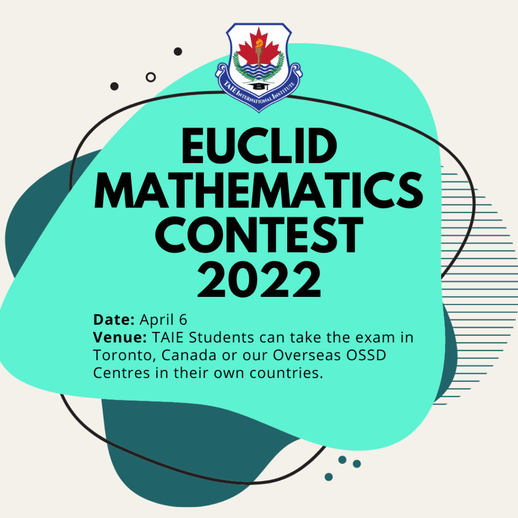 March 17 Euclid Mathematics Contest 2022 is coming in April! TAIE Students will take the test on our main campus in Toronto, Canada, and our Overseas OSSD Centres in their home countries. This year, Euclid Mathematics Contest will take place on April 6, students will be challenged to solve problems in geometry, algebra, and trigonometry. Prizes will be awarded to the top students in each grade level. The contest’s mix of short-answer and full-solution questions challenge students to practise communicating their thinking, and with the final questions some of the most challenging among all of our contests, the Euclid helps learners build perseverance, a key component of mathematical problem-solving. Please consult the school or the guidance counsellors at the OSSD centres for more details.